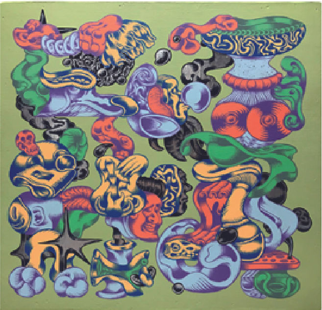 그래피티, 만화, 비디오게임 캐릭터 등 소년 시절에 충실히 쌓아 온 유럽풍 스타일들은 한국적 이미지들과 만나 ‘스며들고 닮아가며’ 재조합되고 재해석된 새로운 그림체로 점차 거듭난다. 현대적인 그래피티 레터링과 태깅이 전통의 문자도와 만나고, 한옥의 막새와 단청, 조각보와 민화의 문양들은 아이스크림과 크루와상, 만화 캐릭터 사이 사이로 이질적인 존재감을 뽐낸다. 한국의 간결한 먹선과 단조로운 색상은 풍부하고 세련된 프렌치 컬러와 뒤섞이며 절제된 밀고 당김의 신선함을 담아낸다.